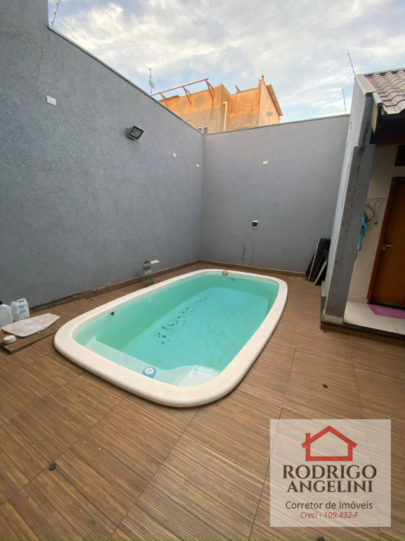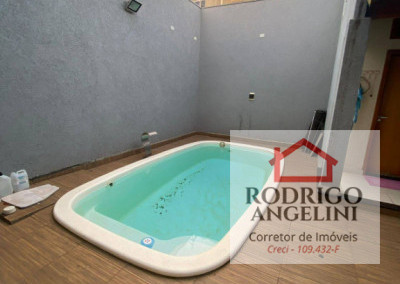 Área de lazer com piscina, churrasqueira